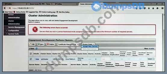 In the Cluster Administration screen of a PresenceServices cluster, when you try to change the cluster state to Accept New Service, you receive the error: