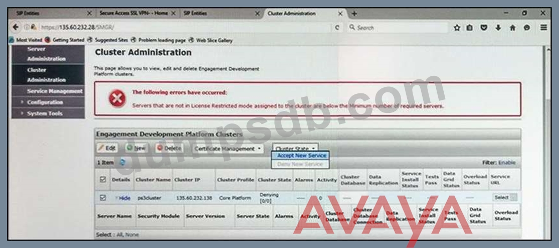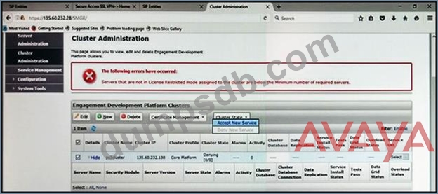 In the Cluster Administration screen of a PresenceServices cluster, when you try to change the cluster state to Accept New Service, you receive the error: