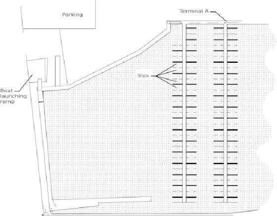 In this future marina layout, what would be the pre-cabling guideline to follow for the terminal A?