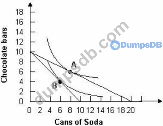 Refer to the graph below. Assuming a consumer has $5 to spend, if a soda costs $0.50 and a chocolate bar costs $0.50, the consumer would optimally choose to consume: