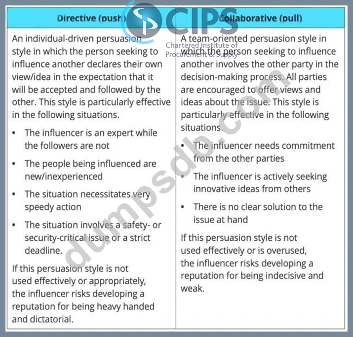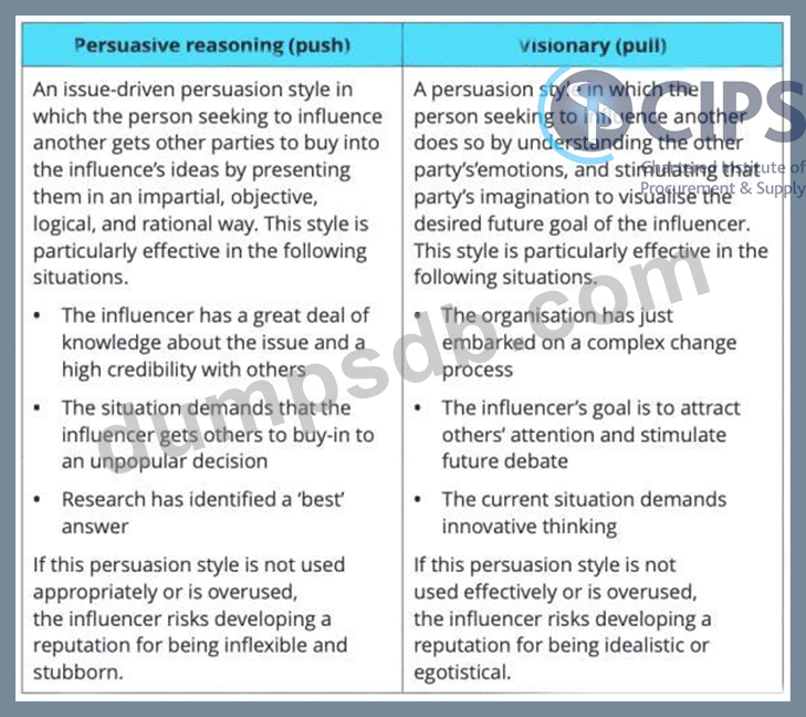 There are two major persuasion methods: 'push' and 'pull'. Persuasion can be defined as encouraging someone to do something that you want them to do for you. Persuasion is reasoning with someone so that they will believe or do something they might not otherwise do. Persuasion can be considered as 'pushing' on TOP so that they can accept the change in attitude or behaviour as a result of your actions. Influence is the ability to affect the manner of thinking of another. Influence can be considered as pulling on TOP so that you achieve the same result, but TOP feels they have changed their attitude or behaviour as a resultof their reflection and thinking, and not your direct actions. There are multiple variables to consider when choosing between 'push' and 'pull'. Professor Fiona Dent of Ashridge Business School proposes situations when each style might be most appropriate, breaking down push into 'directive' and 'reasoning' and 'pull' into 'collaborative' and 'visionary': Table Description automatically generated Text Description automatically generated Using logical and objective reasons is one of the typical characteristics of persuasion reasoning method.