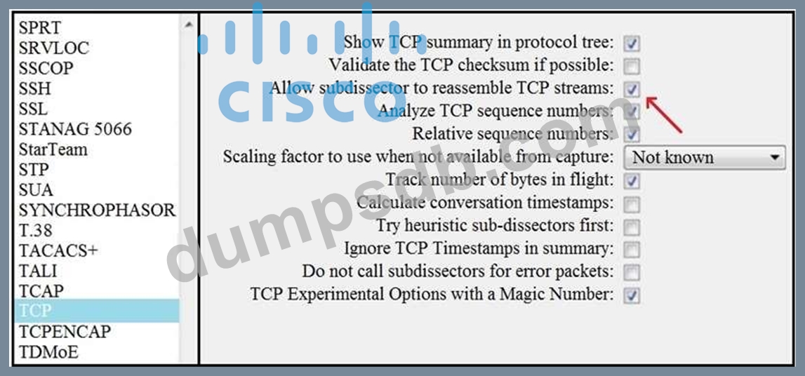 Refer to the exhibit. What is the expected result when the "Allow subdissector to reassemble TCP streams" feature is enabled?