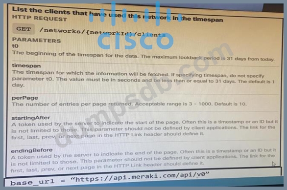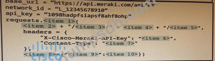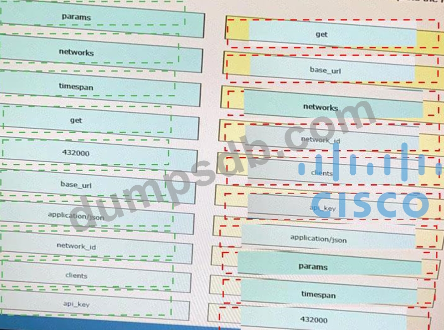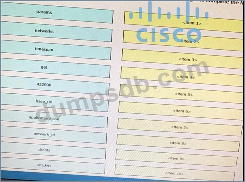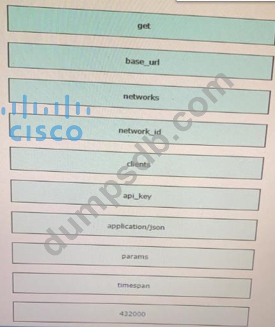Drag and drop the code from the left code from the left onto the item number on the right to complete the Meraki code to obtain a list of client which have used this network.