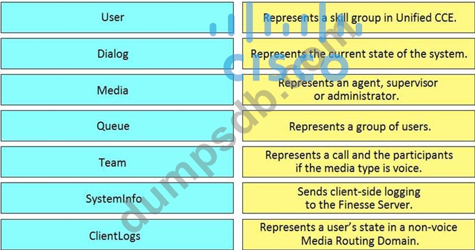 Drag and drop the element of the Finesse API on the left onto the description of its functionally on the right.