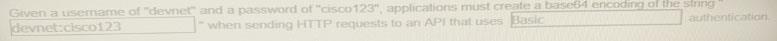 Given a username of "devnet" And a password "Cisco123", applications must create a base64 encoding of the string" ____________ " when sanding HTTP requests to an API that uses _______________ authentication.