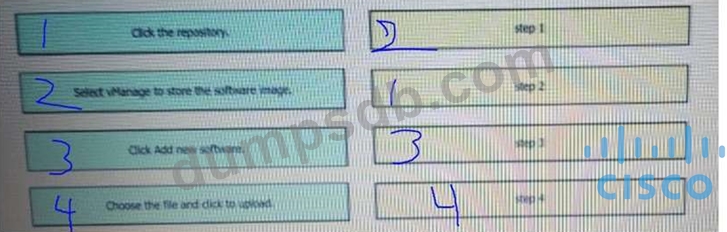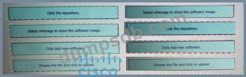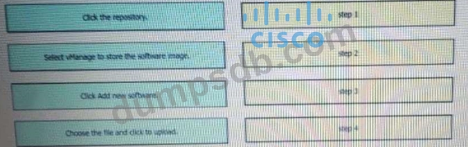Drag and drop the steps from the left into the order on the right to upload software on vManage repository that is accessible from maintenance > Software Repository.