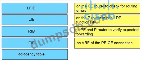 An engineer is troubleshooting end-to-end customer traffic across an MPLS VPN service provider network. Which tasks should the engineer use to solve the routing issues? Drag and drop the table types from the left onto the most useful troubleshooting tasks/router types on the right. (Not all options are used.)