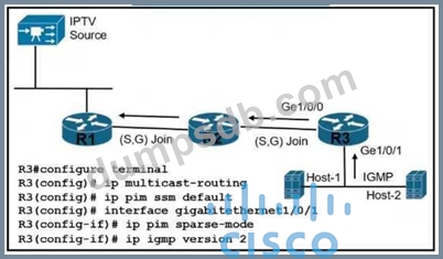 Refer to the exhibit. A customer reports that Host-1 is failing to receive streaming traffic from the IPTV source. The engineer has confirmed that hosts on router R2 are receiving traffic normally and that Host-1 is correctly sending subscription messages to join the IPTV stream.