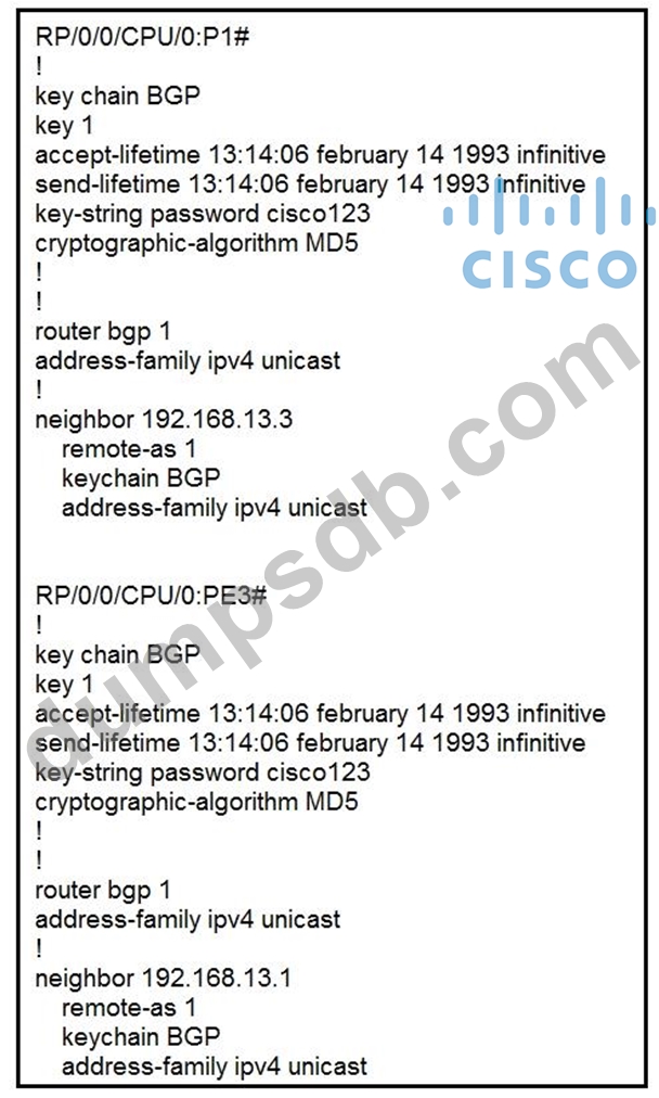P1 and PE3 Cisco IOS XR routers are directly connected and have this configuration applied. The BGP session is not coming up. Assume that there is no IP reachability problem and both routers can open tcp port 179 to each other. Which two actions fix the issue? (Choose two.)