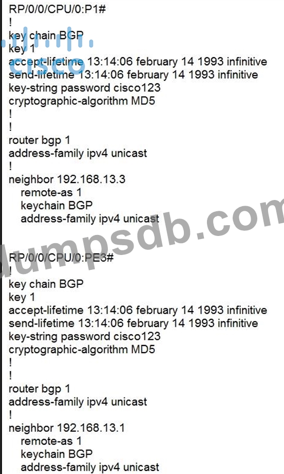 P1 and PE3 Cisco IOS XR routers are directly connected and have this configuration applied. The BGP session is not coming up. Assume that there is no IP reachability problem and both routers can open tcp port 179 to each other. Which two actions fix the issue? (Choose two.)