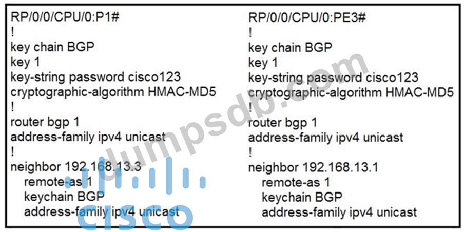 P1 and PE3 Cisco IOS XR routers are directly connected and have this configuration applied. The BGP session is not coming up. Assume that there is no IP reachability problem and both routers can open tcp port 179 to each other. Which action fixes the issue?