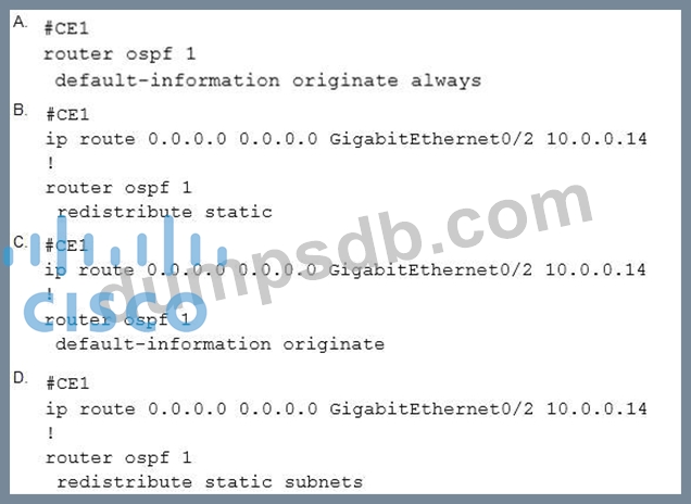 CE1 is the gateway router into the provider network via PE1. A network operator must inject a default route into OSPF area 0. All devices inside area 0 must be able to reach PE1. Which configuration achieves this goal?