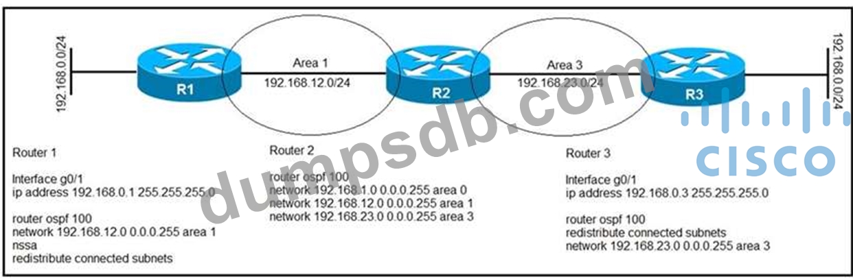 After troubleshooting an OSPF adjacency issue, routers 1, 2, and 3 have formed OSPF neighbor relationships. Which statement about the configuration is true?