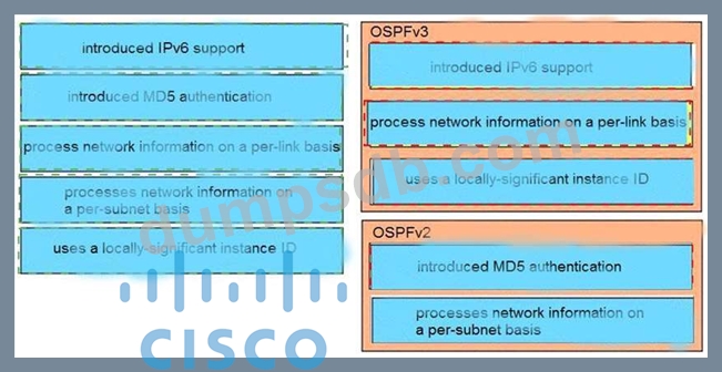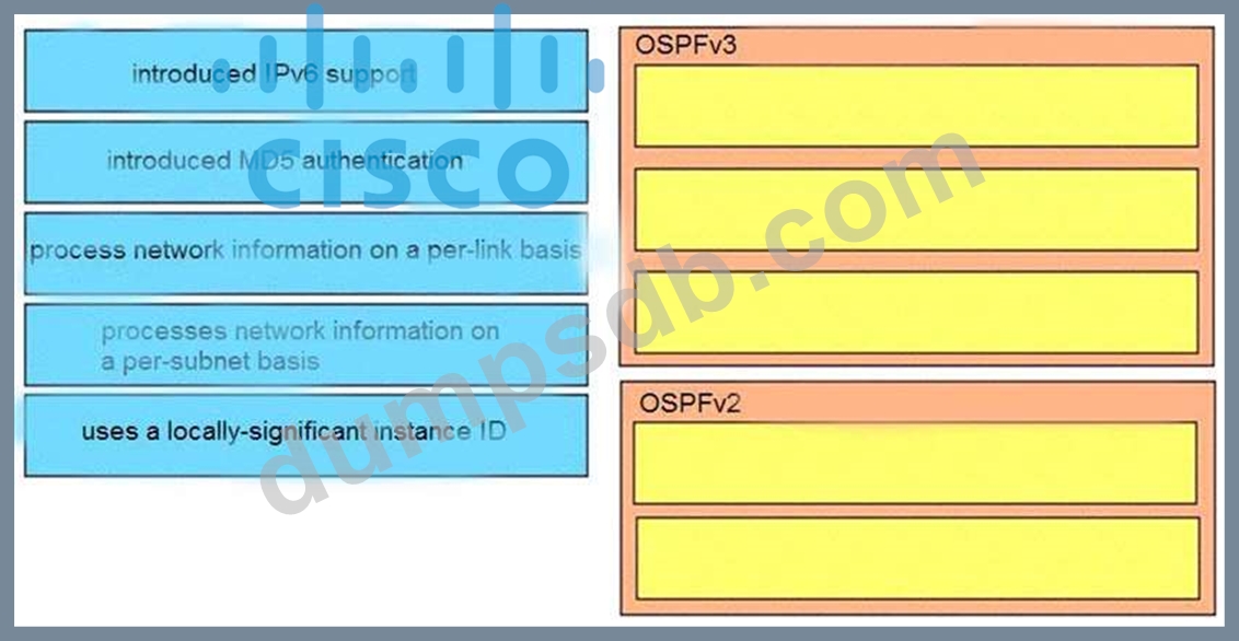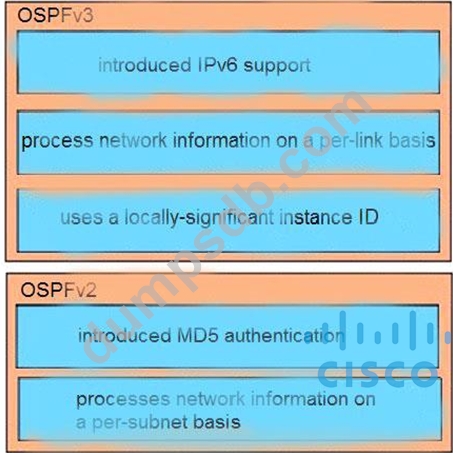 Compare different features between OSPFv2 and OSPFv3. Drag and drop the descriptions of OSPF from the left onto the correct OSPF versions on the right.