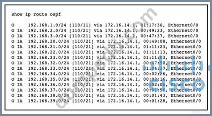 192.168.23.0/24) in area 1 and eight networks (192.168.32.0/24 to 192.168.39.0/24) in area 2 to stop the flooding of all the customer routes. While checking the routing table of R2, the engineer noticed that R1 is still sending only specific routes to R2.