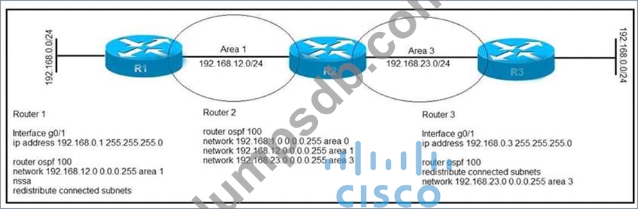 After troubleshooting an OSPF adjacency issue, routers 1, 2, and 3 have formed OSPF neighbor relationships. Which statement about the configuration is true?
