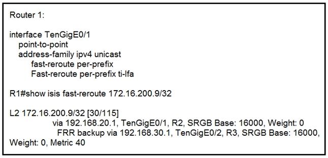 Router 1 is connected to router 2 on interface TenGigE0/1. Which interface provides the alternate path to 172.16.200.9/32 when the link between router 1 and router 2 goes down?