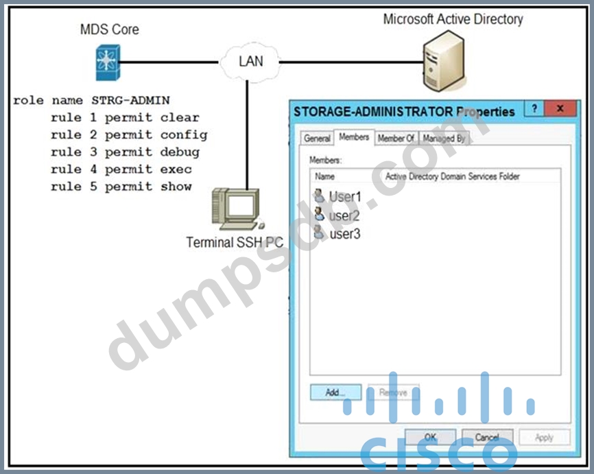 An engineer is troubleshooting why user1, user2, and user3 from group STORAGE- ADMINISTRATOR in Microsoft Active Directory cannot log in to the Cisco MDS SSH CLI. Which action resolves the issue?