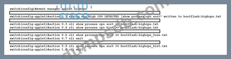 Refer to the exhibit. The EEM script is applied in the default VDC to collect the outputs during high CPU utilization on the Cisco Nexus 7000 Series Switch for all VDCs. Which configuration set must be added to the script to fix the issue?