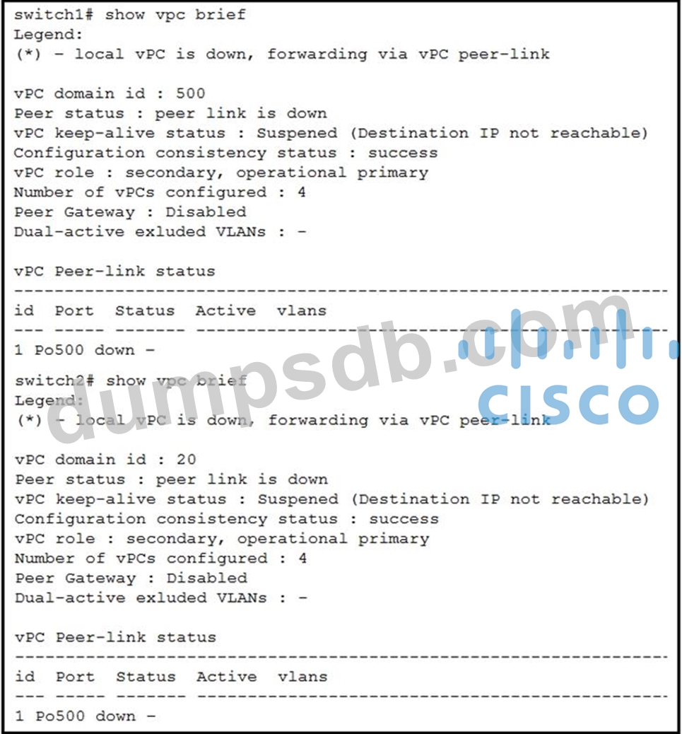 vPC between switch1 and switch2 is not working. Which two actions are needed to fix the problem? (Choose two.)