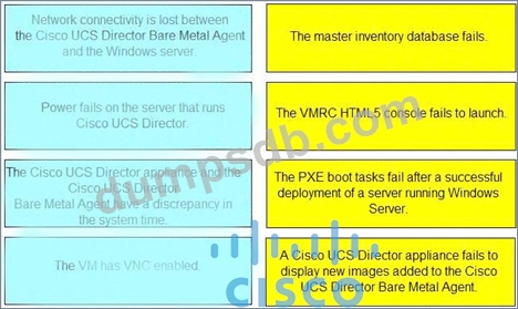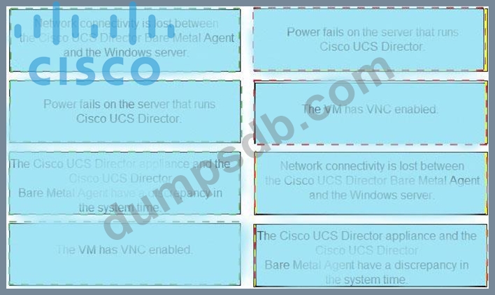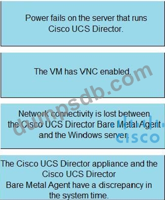 An engineer is troubleshooting issues in Cisco UCS Director. Drag and drop the possible causes from the left onto the correct issues on the right.