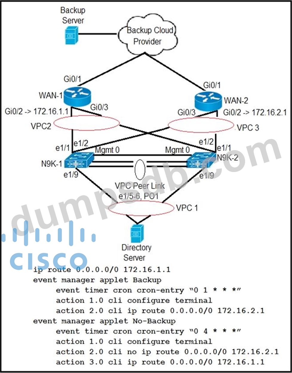 The client says that at the scheduled time for backup, the data center server failed to use the WAN-2 link to back up the servers to the cloud backup system. What is the solution to this problem?
