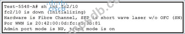Refer to the exhibit. A new Cisco Nexus 5548 Switch connects to a network. SAN switching is configured on the switch. The switch fc2/10 NP uplink is shown in the exhibit. Which action ensures that fc2/10 is in an up state?