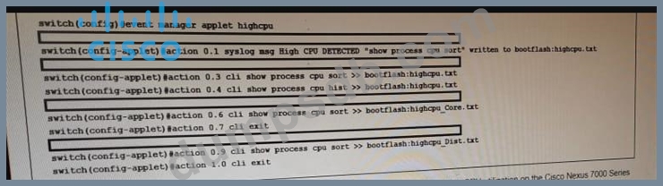 The EEM script is applied in the default VDC to collect the outputs during high CPU utilization on the Cisco Nexus 7000 Series Switch for all VDCs. Which configuration set must be added to the script to fix the issue?