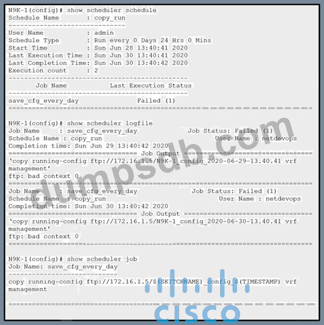 The scheduler was configured to save the running-config automatically daily. However, the scheduler is returning the error presented. Which action resolves the issue?