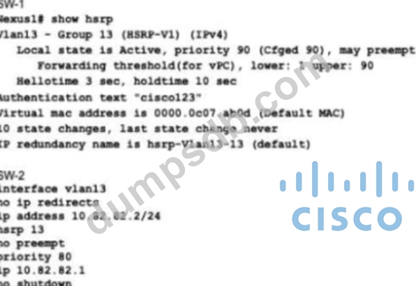 A recent configuration change removes the HSRP adjacency between the SW-1 and SW-2 Cisco Nexus switches. The change causes the servers on this subnet to lose Internet access. Which action restores the connectivity of all servers on VLAN 13?