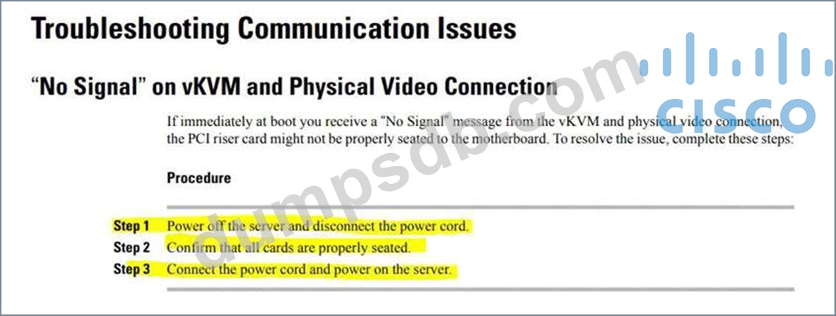 During a boot process of a Cisco UCS C-Series Rack Server, an engineer receives a "No Signal" message from the vKVM and physical connection. Which set of steps resolves the issue?