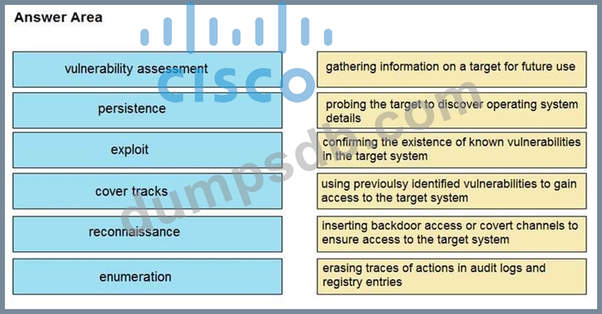 Drag and drop the phases to evaluate the security posture of an asset from the left onto the activity that happens during the phases on the right.