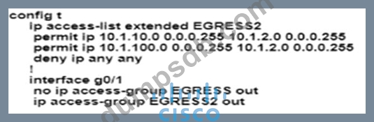 An engineer must modify the access control list EGRESS to allow all IP traffic from subnet 10.1.10.0/24 to 10.1.2.0/24. The access control list is applied in the outbound direction on router interface GigabitEthemet 0/1. Which configuration commands can the engineer use to allow this traffic without disrupting existing traffic flows?