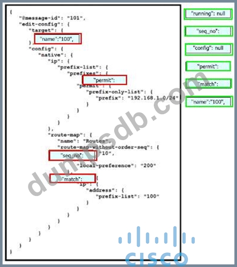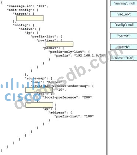 Drag and drop the snippets onto the blanks within the code to construct a script that adds a prefix list to a route map and sets the local preference. Not all options are used