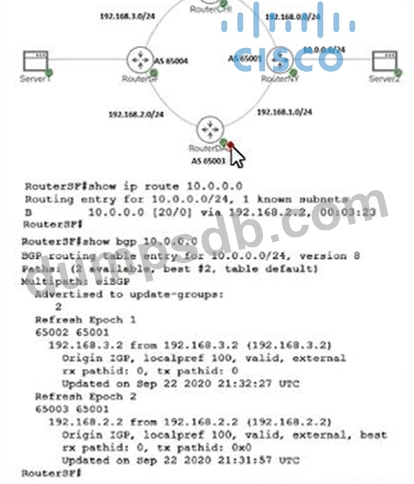 After configuring the BGP network, an engineer verifies that the path between Servers and Server2 Is functional. Why did RouterSF choose the route from RouterDAL instead of the route from RouterCHI?