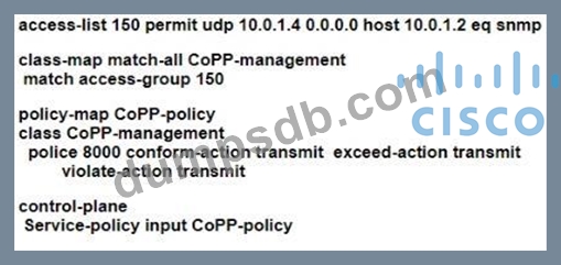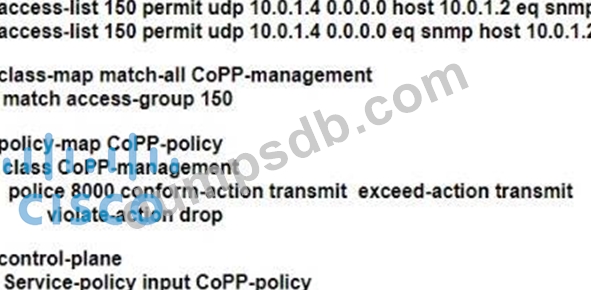 An engineer must configure and validate a CoPP policy that allows the network management server to monitor router R1 via SNMP while protecting the control plane. Which two commands or command sets must be used?