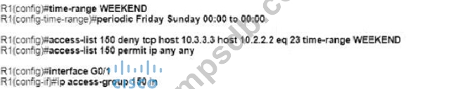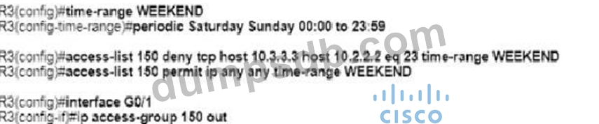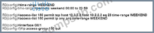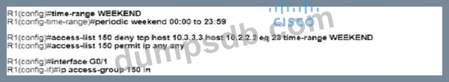 An engineer must deny Telnet traffic from the loopback interface of router R3 to the loopback interface of router R2 during the weekend hours. All other traffic between the loopback interfaces of routers R3 and R2 must be allowed at all times. Which command accomplish this task?