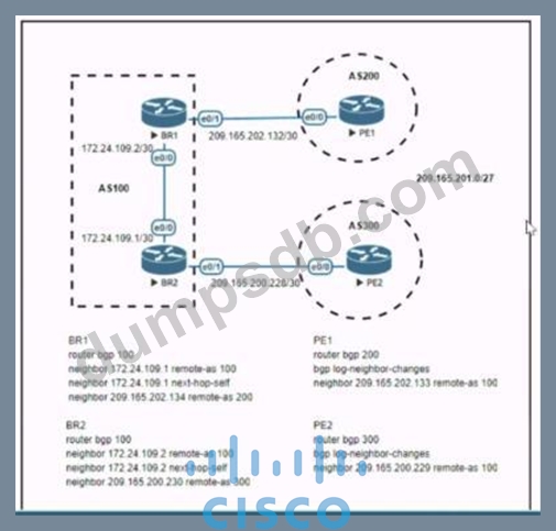 Refer to the exhibit. Which configuration change will force BR2 to reach 209 165 201 0/27 via BR1?