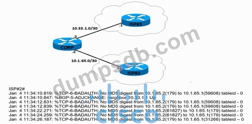 An engineer attempts to establish BGP peering between router CORP and two ISP routers. What is the root cause for the failure between CORP and ISP#2?
