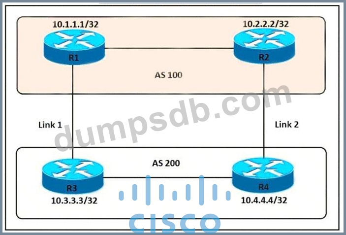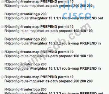 An engineer must ensure that all traffic leaving AS 200 will choose Link 2 as an entry point. Assuming that all BGP neighbor relationships have been formed and that the attributes have not been changed on any of the routers, which configuration accomplish task?
