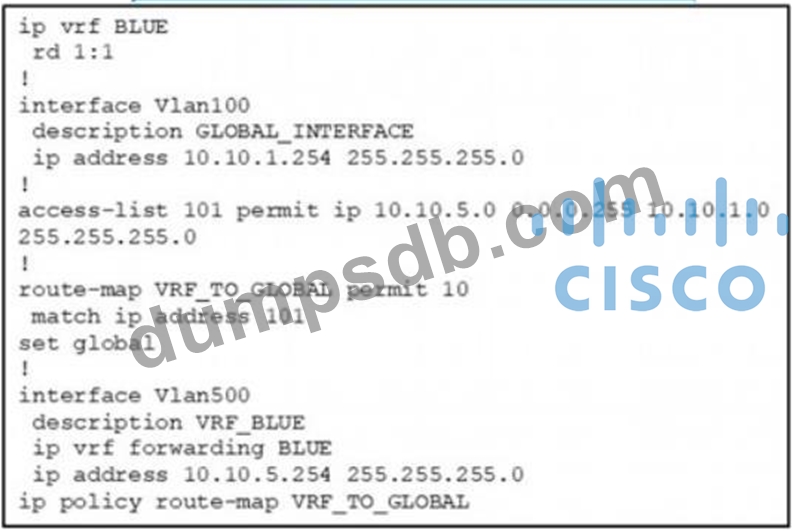 An engineer attempts to create a configuration to allow the Blue VRF to leak into the global routing table, but the configuration does not function as expected. Which action resolves this issue?
