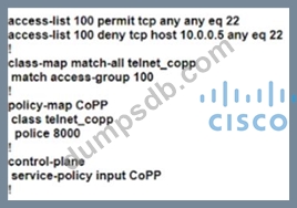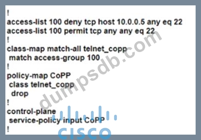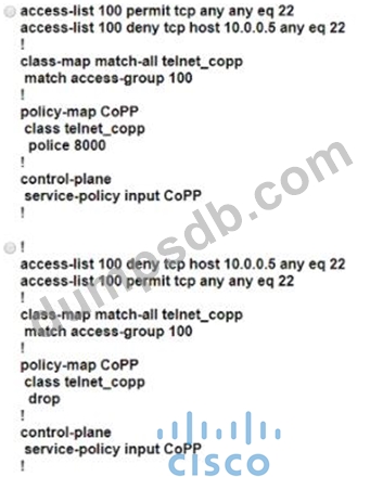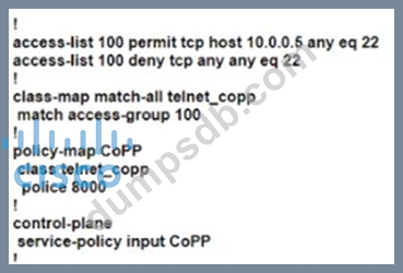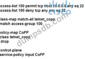 Which configuration creates a CoPP policy that provides unlimited SSH access from dient 10.0.0.5 and denies access from all other SSH clients'?