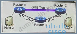 MTU has been configured on the underlying physical topology, and no MTU command has been configured on the tunnel interfaces. What happens when a 1500-byte IPv4 packet traverses the GRE tunnel from host X to host Y, assuming the DF bit is cleared?