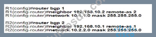 Explanation With BGP, we must advertise the correct network and subnet mask in the "network" command (in this case network 10.1.1.0/24 on R1 and network 10.2.2.0/24 on R2). BGP is very strict in the routing advertisements. In other words, BGP only advertises the network which exists exactly in the routing table. In this case, if you put the command "network x.x.0.0 mask 255.255.0.0" or "network x.0.0.0 mask 255.0.0.0" or "network x.x.x.x mask 255.255.255.255" then BGP will not advertise anything. It is easy to establish eBGP neighborship via the direct link. But let's see what are required when we want to establish eBGP neighborship via their loopback interfaces. We will need two commands: + the command "neighbor 10.1.1.1 ebgp-multihop 2" on R1 and "neighbor 10.2.2.2 ebgpmultihop 2" on R1. This command increases the TTL value to 2 so that BGP updates can reach the BGP neighbor which is two hops away. + Answer 'R1 (config) #router bgp 1 R1 (config-router) #neighbor 192.168.10.2 remote-as 2 R1 (config-router) #network 10.1.1.0 mask 255.255.255.0 R2 (config) #router bgp 2 R2 (config-router) #neighbor 192.168.10.1 remote-as 1 R2 (config-router) #network 10.2.2.0 mask 255.255.255.0 Quick Wireless Summary Cisco Access Points (APs) can operate in one of two modes: autonomous or lightweight + Autonomous: self-sufficient and standalone. Used for small wireless networks. + Lightweight: A Cisco lightweight AP (LAP) has to join a Wireless LAN Controller (WLC) to function. LAP and WLC communicate with each other via a logical pair of CAPWAP tunnels. - Control and Provisioning for Wireless Access Point (CAPWAP) is an IETF standard for control messaging for setup, authentication and operations between APs and WLCs. CAPWAP is similar to LWAPP except the following differences: +CAPWAP uses Datagram Transport Layer Security (DTLS) for authentication and encryption to protect traffic between APs and controllers. LWAPP uses AES. + CAPWAP has a dynamic maximum transmission unit (MTU) discovery mechanism. + CAPWAP runs on UDP ports 5246 (control messages) and 5247 (data messages) An LAP operates in one of six different modes: + Local mode (default mode): measures noise floor and interference, and scans for intrusion detection (IDS) events every 180 seconds on unused channels + FlexConnect, formerly known as Hybrid Remote Edge AP (H-REAP), mode: allows data traffic to be switched locally and not go back to the controller. The FlexConnect AP can perform standalone client authentication and switch VLAN traffic locally even when it's disconnected to the WLC (Local Switched). FlexConnect AP can also tunnel (via CAPWAP) both user wireless data and control traffic to a centralized WLC (Central Switched). + Monitor mode: does not handle data traffic between clients and the infrastructure. It acts like a sensor for location-based services (LBS), rogue AP detection, and IDS + Rogue detector mode: monitor for rogue APs. It does not handle data at all. + Sniffer mode: run as a sniffer and captures and forwards all the packets on a particular channel to a remote machine where you can use protocol analysis tool (Wireshark, Airopeek, etc) to review the packets and diagnose issues. Strictly used for troubleshooting purposes. + Bridge mode: bridge together the WLAN and the wired infrastructure together. Mobility Express is the ability to use an access point (AP) as a controller instead of a real WLAN controller. But this solution is only suitable for small to midsize, or multi-site branch locations where you might not want to invest in a dedicated WLC. A Mobility Express WLC can support up to 100 Aps