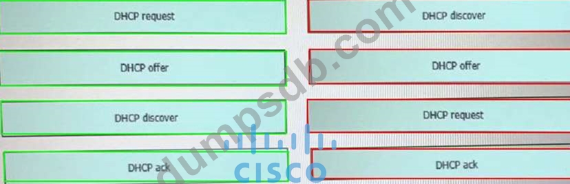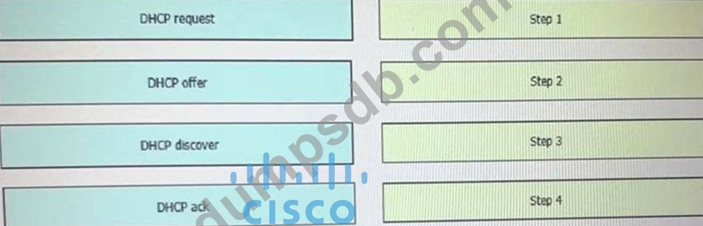 Drag and drop the DHCP messages that are exchanged between a client and an AP into the order they are exchanged on the right. There are four messages sent between the DHCP Client and DHCP Server: DHCPDISCOVER, DHCPOFFER, DHCPREQUEST and DHCPACKNOWLEDGEMENT. This process is often abbreviated as DORA (for Discover, Offer, Request, Acknowledgement).