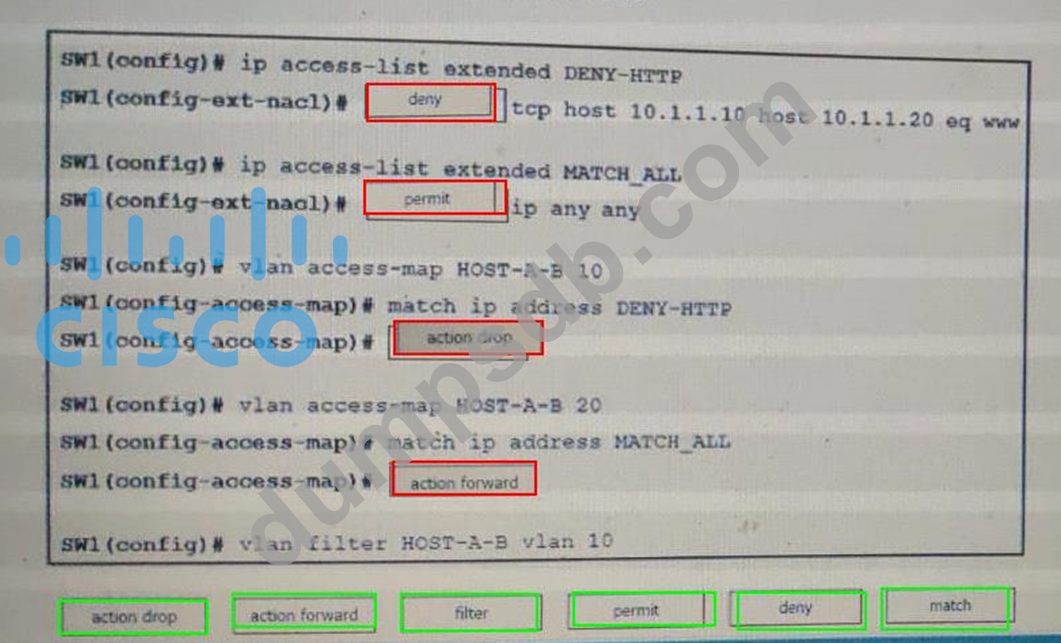 Refer to the exhibit. An engineer must deny HTTP traffic from host A to host V while allowing all other communication between the hosts, drag and drop the commands into the configuration to achieve these results. Some commands may be used more than once. Not all commands are used.