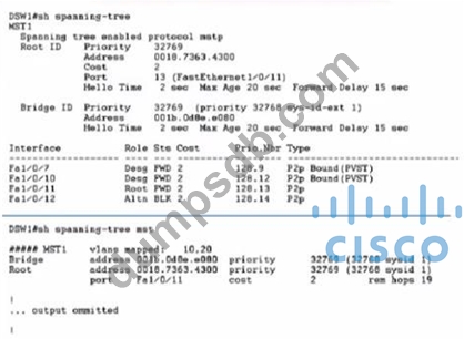 Which two commands ensure that DSW1 becomes root bridge for VLAN 10 and 20?