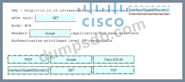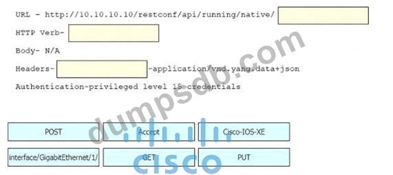 Refer to the exhibit Drag and drop the snippets into the RESTCONF request to form the request that returns this response Not all options are used