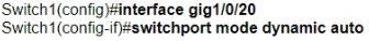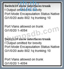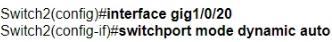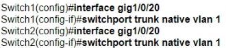 The trunk does not work over the back-to-back link between Switch1 interface Giq1/0/20 and Switch2 interface Gig1/0/20. Which configuration fixes the problem?