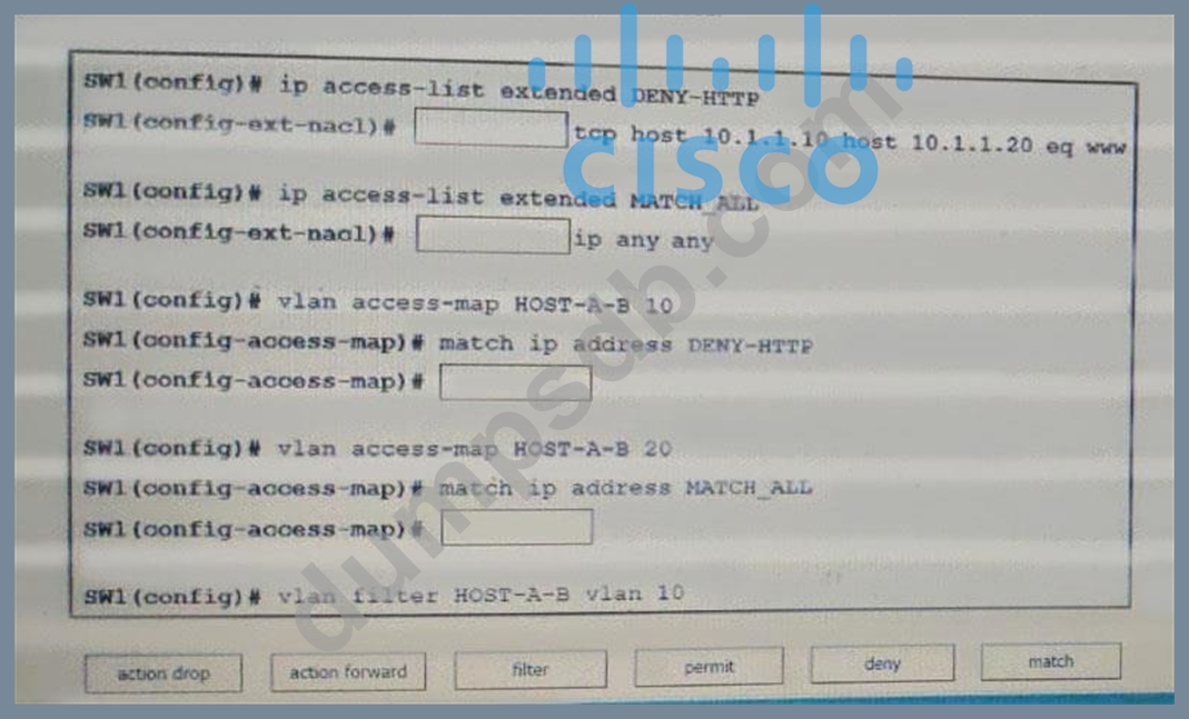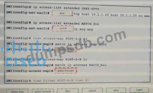 Refer to the exhibit. An engineer must deny HTTP traffic from host A to host V while allowing all other communication between the hosts, drag and drop the commands into the configuration to achieve these results.
